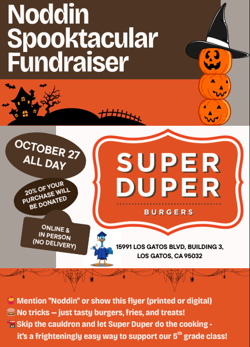 No tricks, just treats! Skip the cauldron and dine out on Monday, 10/27 at Super Duper Burgers! 🍔 🍟Every bite helps boo-st 👻 5th grade fundraising — so you can feed your ghouls and goblins and still have time to creep through your last-minute Halloween prep! 🕸️