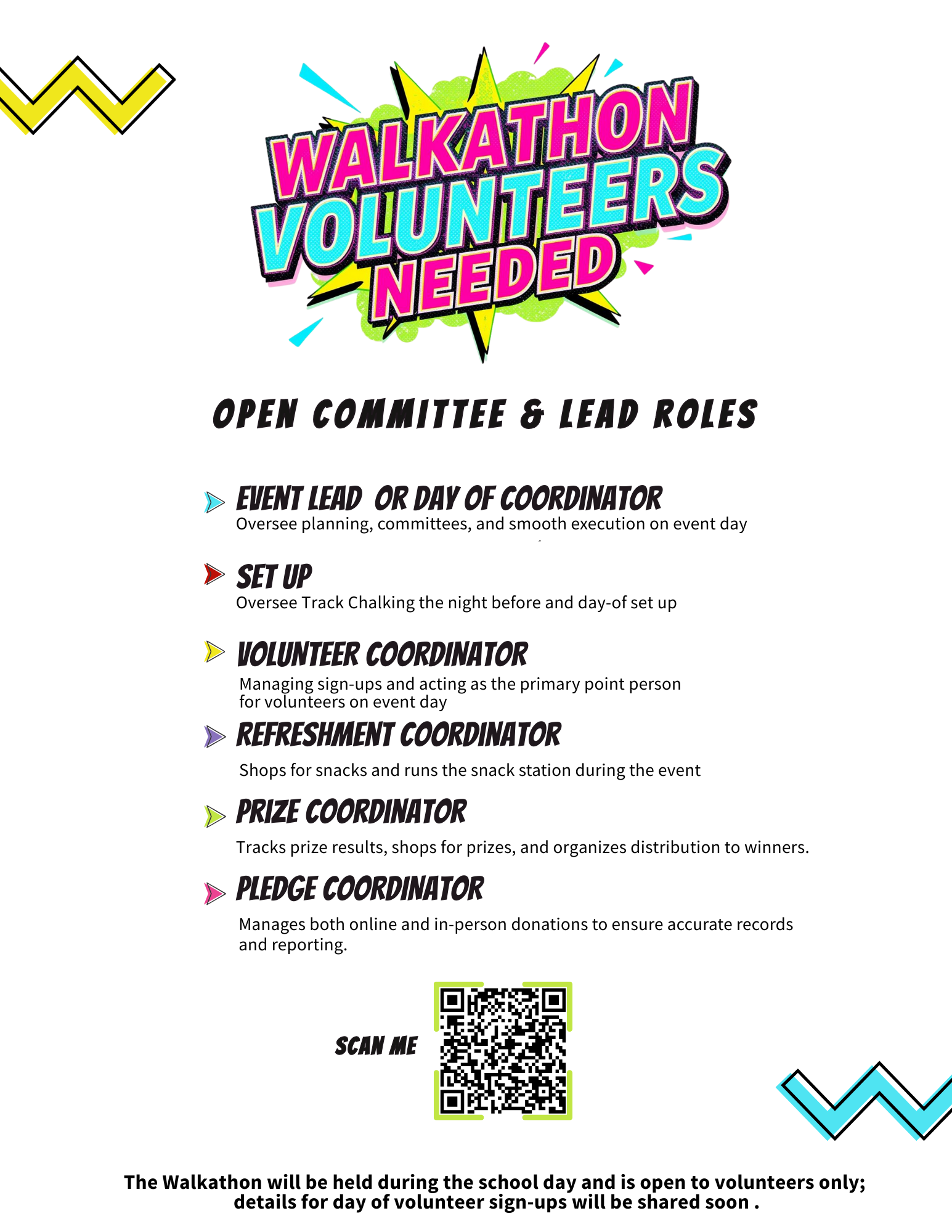 Parents we need your help! Our annual Walkathon is coming up on April 24th and we need volunteer leads to make it a success!